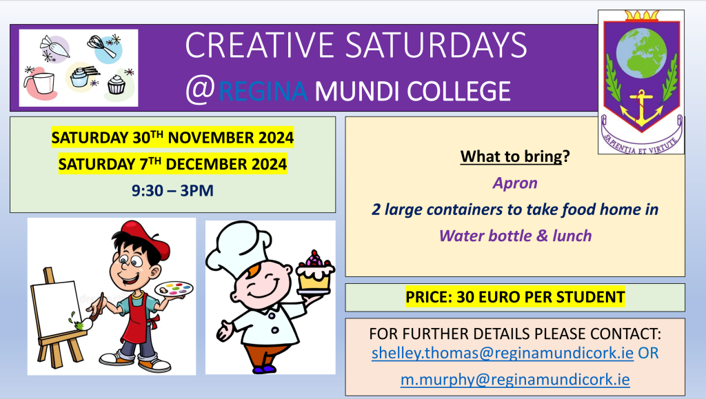 We are delighted to have our Creative Saturdays back at Regina Mundi College. For any 5th and 6th class primary school pupils interested in joining us for a full day creativity through baking and art, please sign up using the email on the flyer.