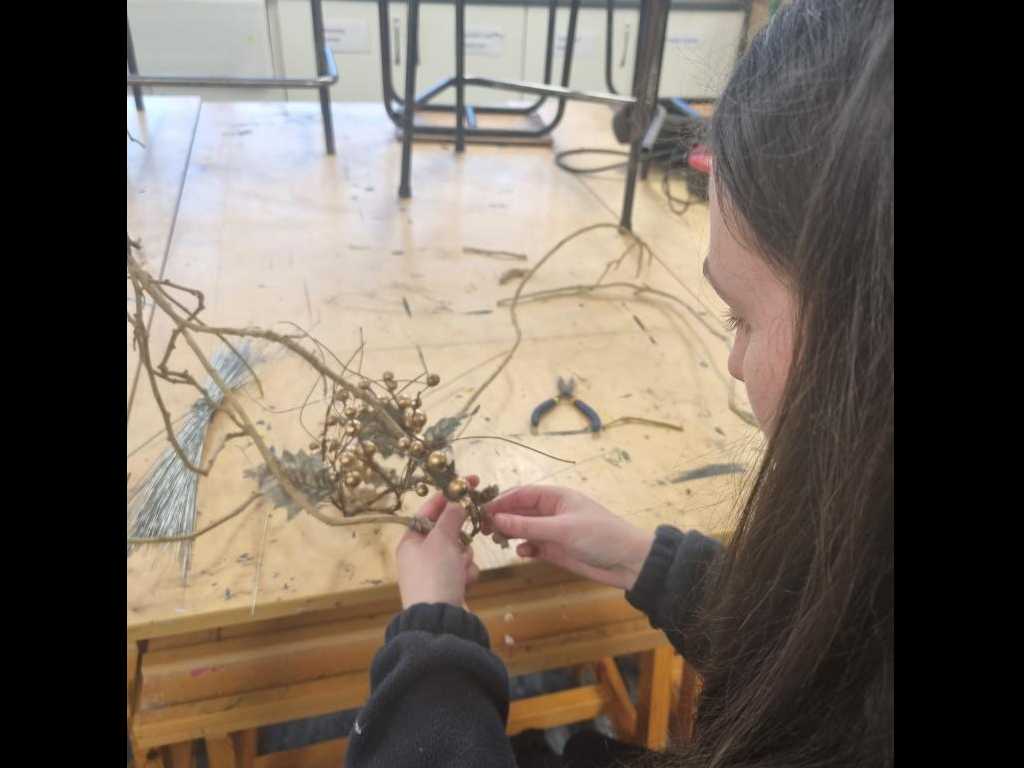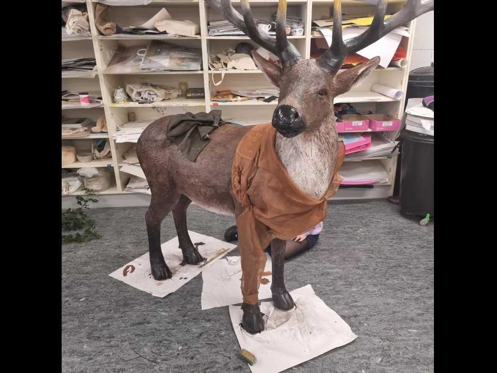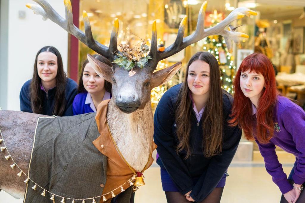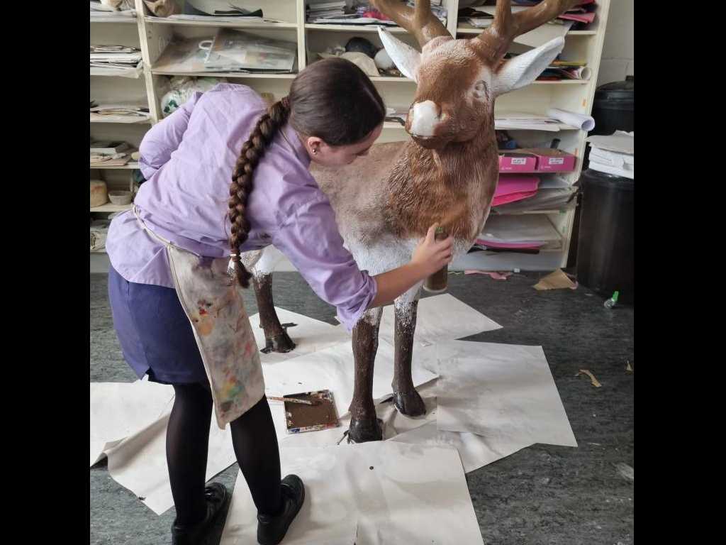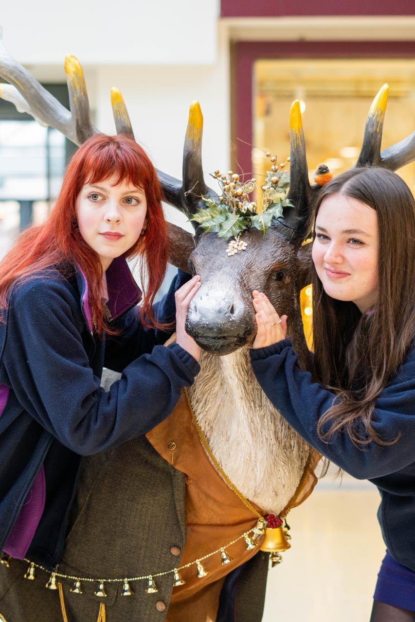 Óengus, our enchanting reindeer, a symbol of imagination and sustainability is inspired by Irish mythology. Óengus brings to life the magic of storytelling and childhood wonder, perfectly aligned with our values. This beautiful community project was created by 4th years Faye Dunwell, Rhian Llyod-Evans, Ella Stephens, Cadhla Cahill-Murphy, Art teacher Ms Murphy and Ms O Brien’s incredible background knowledge in sewing! All clothing and accessories were sourced from local charity shops.