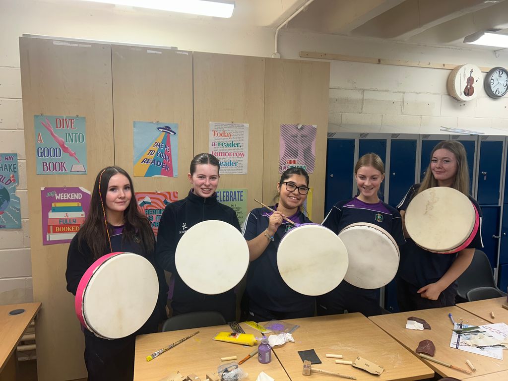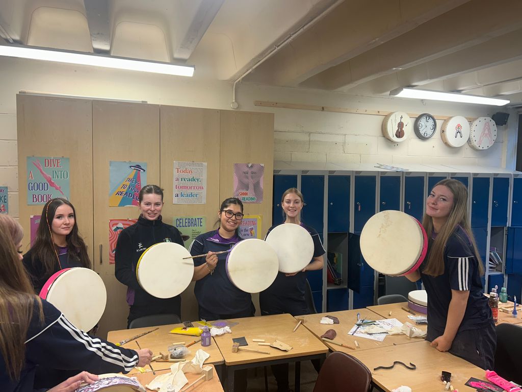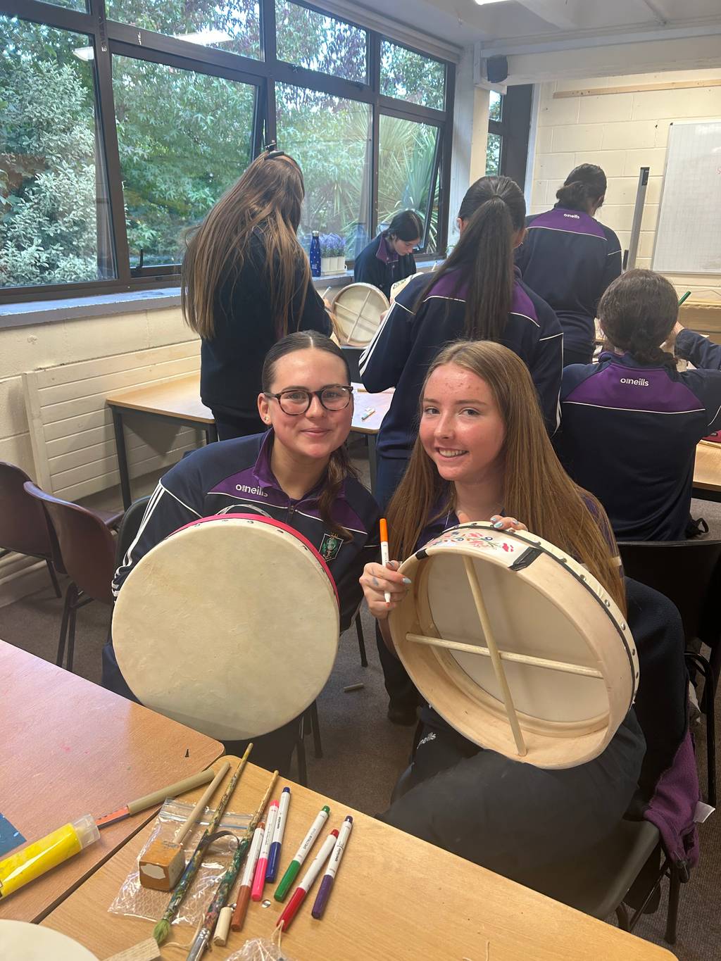 The TY students were busy on Thursday and Friday with two full days of workshops. The workshops included bodhrán making, Woods Driving School and hospitality training. The library was transformed into a restaurant and students learned how to take orders and carry plates. Certificates will be presented to students which will help the students build their CVs. Meanwhile the bodhráns were beautifully decorated and will be on display during Open night. They ended the day by playing a few tunes on the bodhráns.