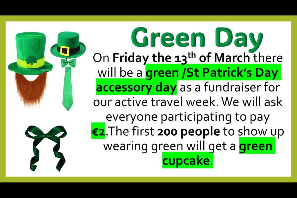 This Friday all students are asked to wear a St Patrick’s day / green accessory and to pay €2 at the door to support the work of the Green Schools Team. The first 200 students to participate will receive a cupcake.
