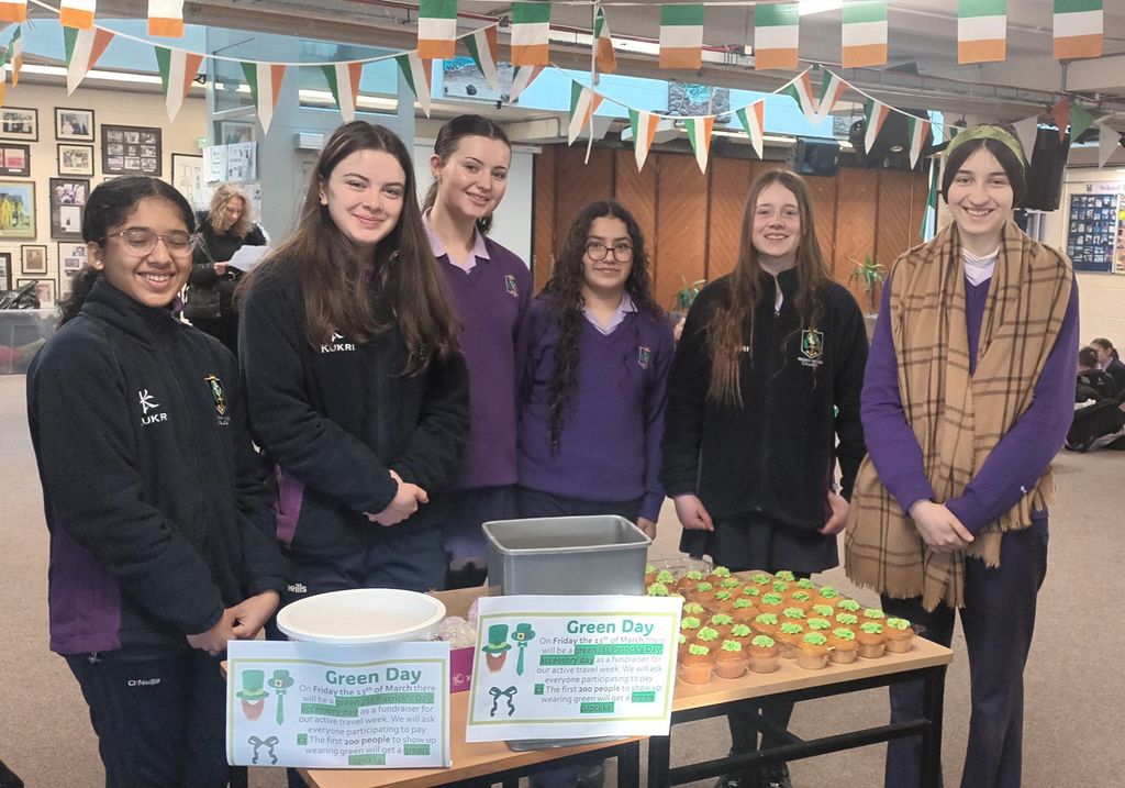 The Green Schools Team arranged a GREEN DAY today. Students were encouraged to wear a green accessory and were given a green cupcake at the door. Thank you to all who participated, helping the girls raise €273.95 towards their sustainability projects. Later in the day was the FASHION SHOW, where each class dressed their class teacher up using sustainable materials. The outfit needed to best represent a person ready for ACTIVE TRAVEL. There was an amazing response from the students and teachers, with some incredibly creative and clever costumes.Congratulations to 5Z and Ms Murphy who were the winners. The class will be treated to a pizza party in the next week.