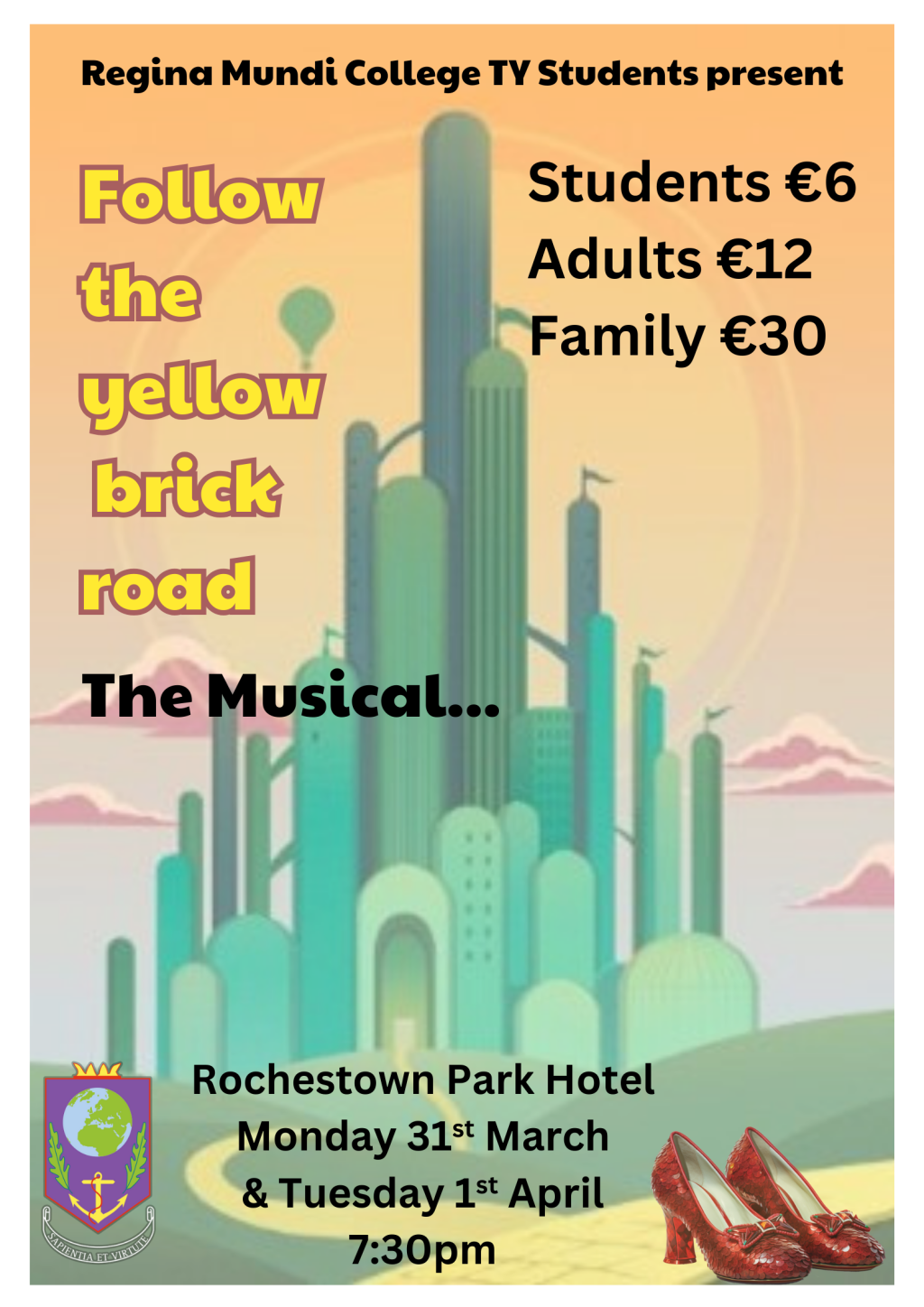 The long awaited Transition Year Musical is finally here. ‘Follow the yellow brick road’ will take place tonight Monday 31st March and Tuesday 1st April in Rochestown Park Hotel at 7:30pm. Tickets are €6 for Students, €12 for Adults and €30 for a Family ticket. You can purchase tickets at the door.