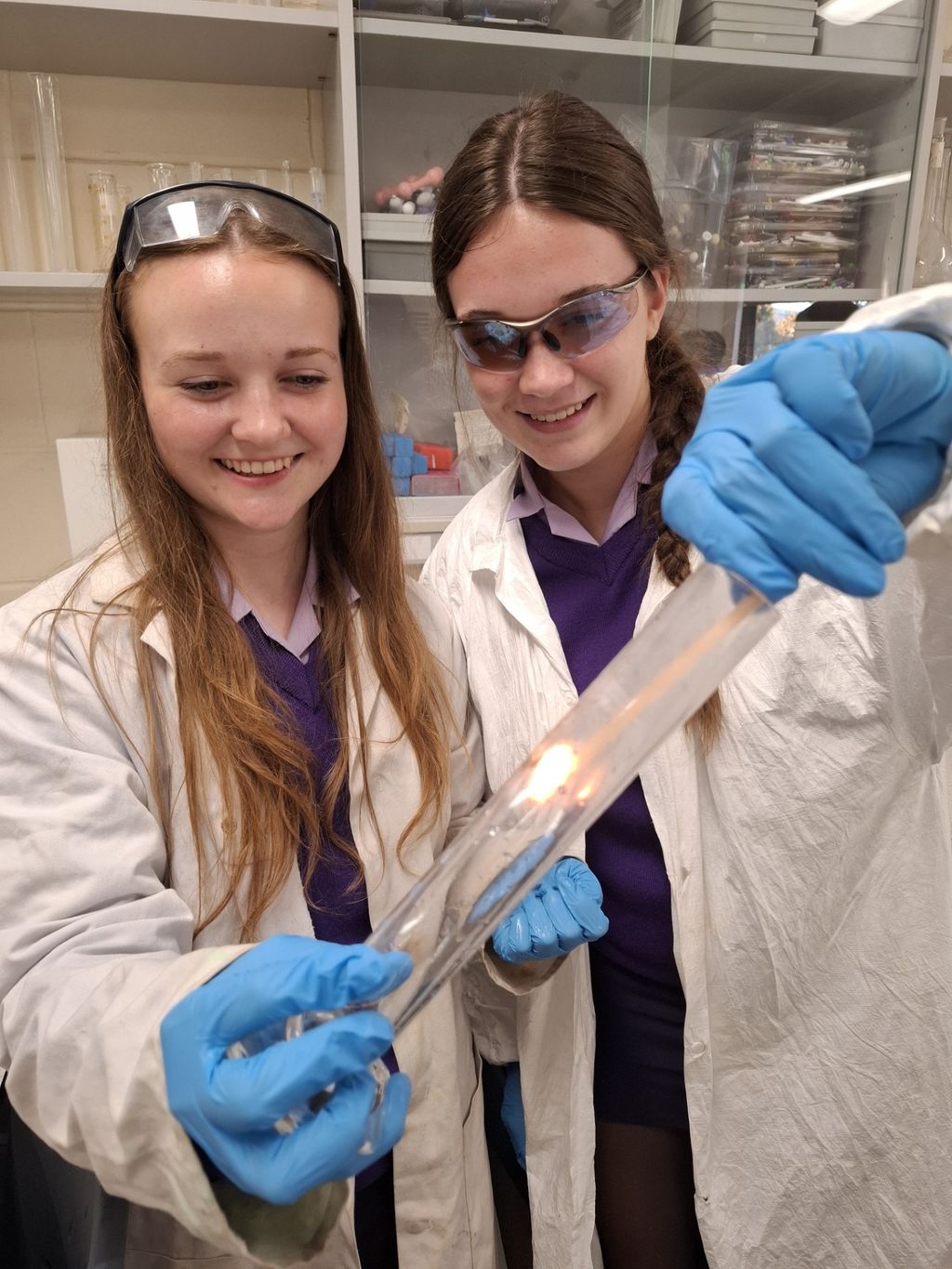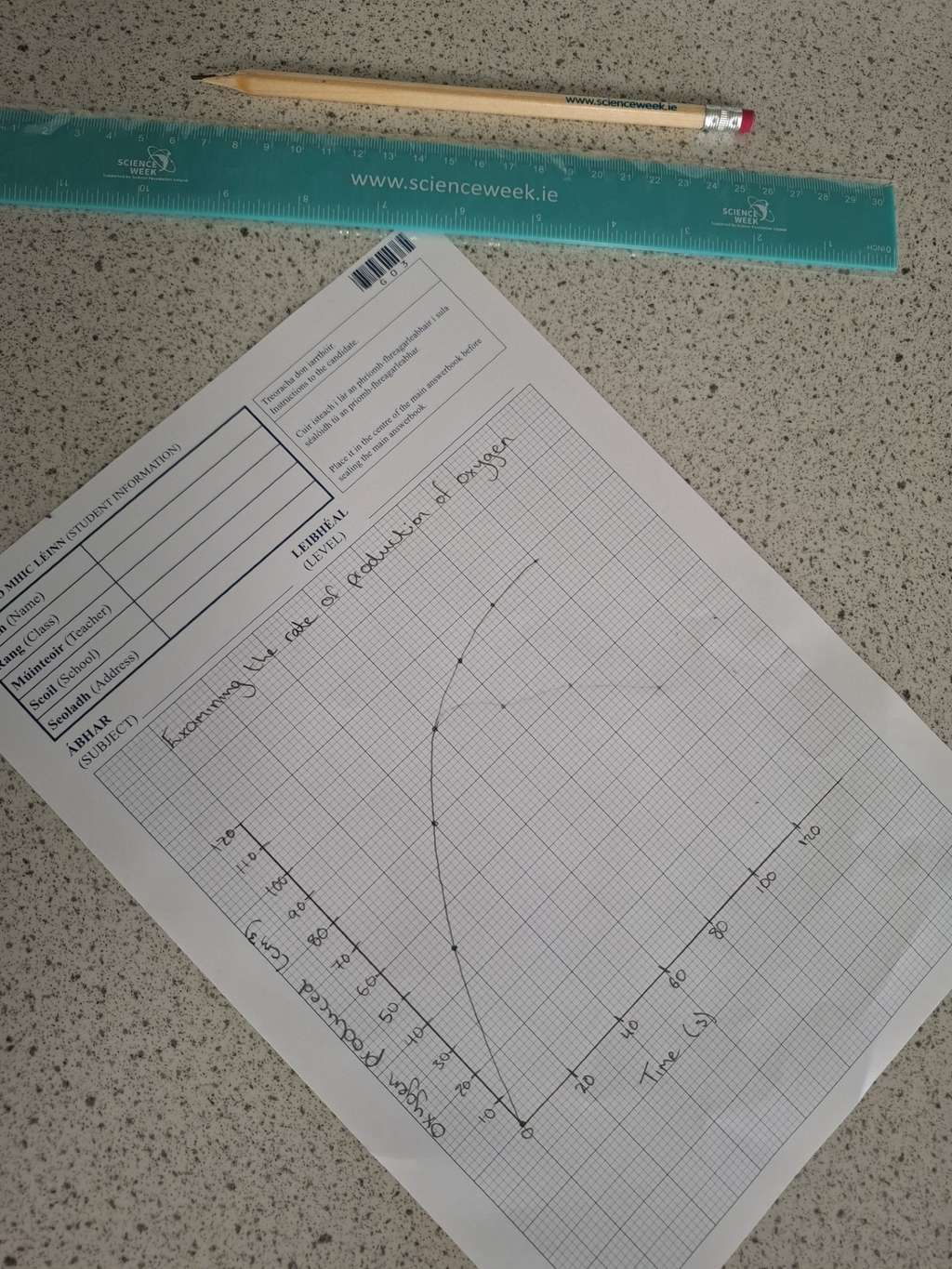 On Thursday, Mr. O’Donovan’s TY Chemistry class investigated the rate of production of oxygen in the Chemistry lab. They used a catalyst (manganese dioxide) to decompose hydrogen peroxide and measured the speed at which oxygen was produced. Afterwards they tested the gas to show that it was oxygen, by relighting a glowing splint. For their efforts they were rewarded with a Science week ruler and pencil which they used to draw their graphs. Well done!